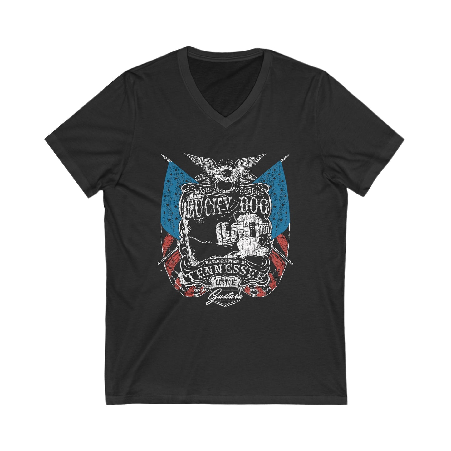 Lucky Dog Short Sleeve V-Neck Tee Custom Guitars Tennessee American Eagle Flag USA Patriotic Stars Stripes Guitar USA